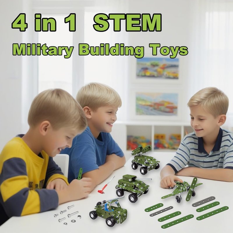 4 in 1 Metal Military Truck STEM Building Projects Metal Army Toys Model Car Kits Set for Boys Age 8-12 Assembly Engineering STEM Kits or Kids 6-8 Engineering Gifts Toys for Ages 14 and Up Adults
