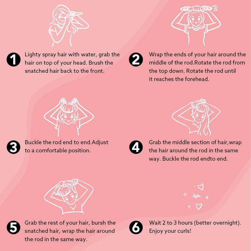- Simple to Use:After shampooing, blow dry until 80% dry. Comb your hair and divide it into three areas from front to back. Gently wrap your hair around the curling rods, then tie it with the silk scarf. After a night's sleep, you will have a naturally beautiful curly hair.
