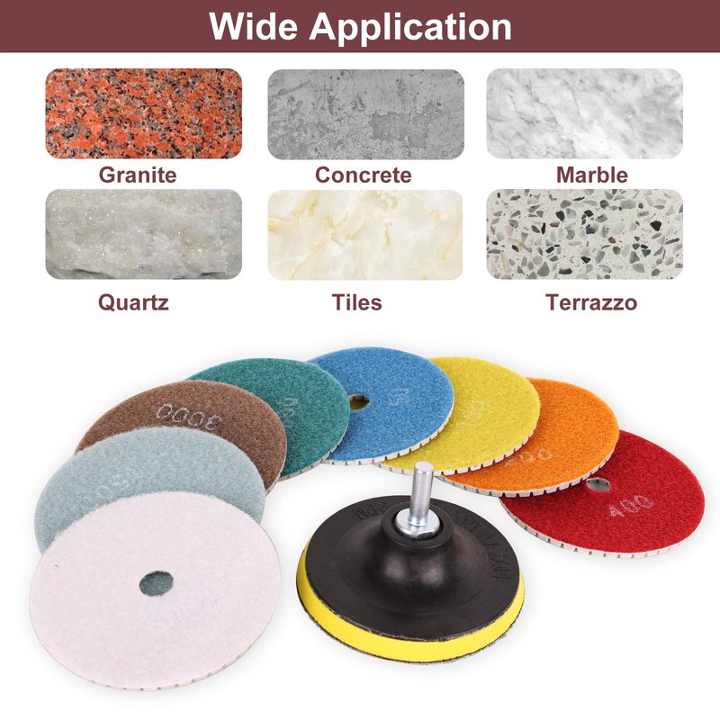 - Premium Quality: These granite polishing kit are made of high-quality diamond powder and resin powder, aggressive and durable. Hook and loop backing pad is made with premium-grade rubber, semi-flexible backer. The flexible design can adjust to different shapes of surface like corner or edge or curve surface.