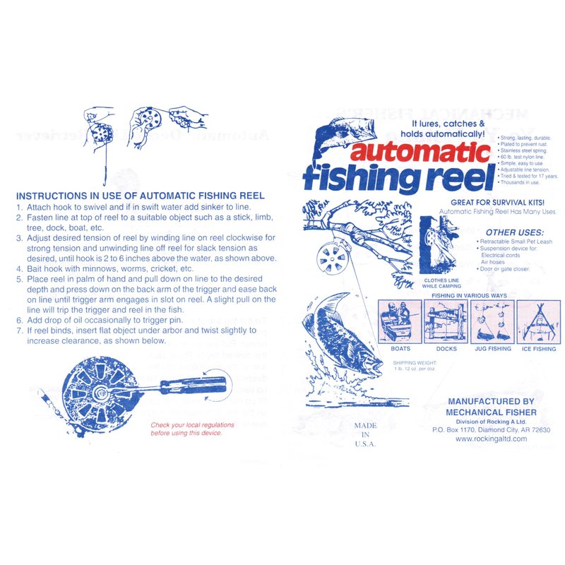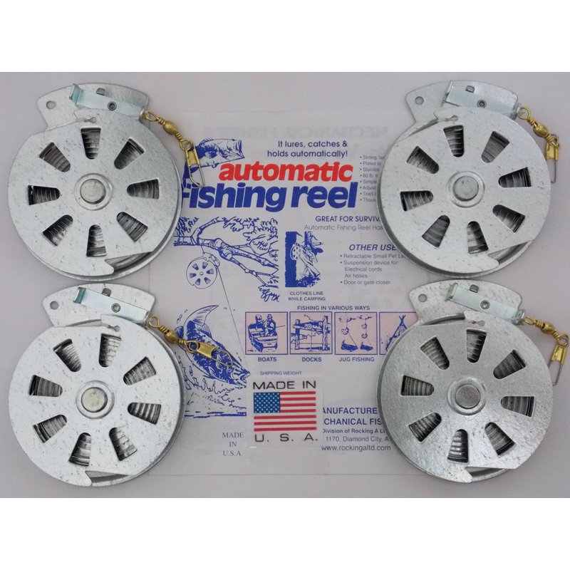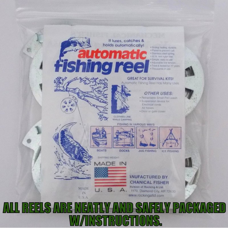 You will receive 4 Mechanical Fisher Reels neatly packaged in a single padded envelope. These are the Best reels on the market. The Stainless Steel Spring is the best choice for Fisherman, Preppers, Survivalists and Hunters. They're very easy to use. Simply attach to the object of your choice, bait the hook, set depth and trigger, then wait. The Mechanical Fisher does the rest. It sets the hook, and retrieves the fish! Kind of like a mouse trap for Fish, but these do not kill the fish! Warning: This product can expose you to chemicals which is [are] known to the State of California to cause cancer and birth defects or other reproductive harm.