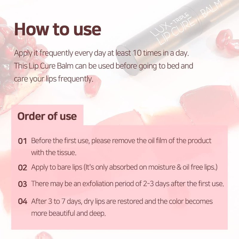 - ✨ How to Use: After preparing your lips without moisture, remove the oil film of the lip balm with a tissue before using for the first time. The oil film protects the surface of the lip balm. Use by pulling out only 1-2mm with the melting formula. Made with natural beeswax. Just add half a turn. The real lip cure balm color comes out when the dead skin cells are removed. / TIP: It is recommended to use within 24 months before opening and within 6 months after opening.