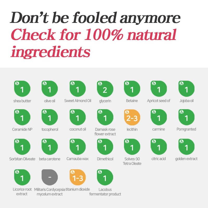 - ✨ Tinted Lip Balm: A non-artificial watercolor color made with natural pigments (pomegranate, carrot, etc.), it allows you to express your lips in a lively, non-sticky, and soft way the more you apply it.