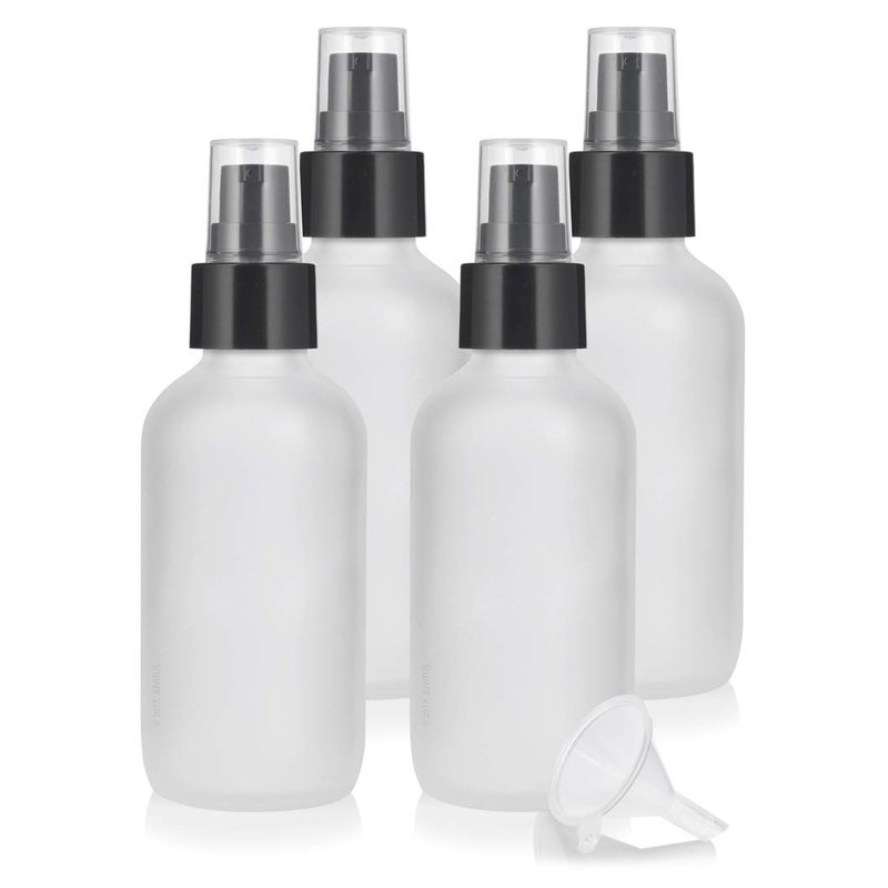 4 oz Frosted Clear Glass Boston Round Bottle with Treatment Pump (4 Pack) + Funnel