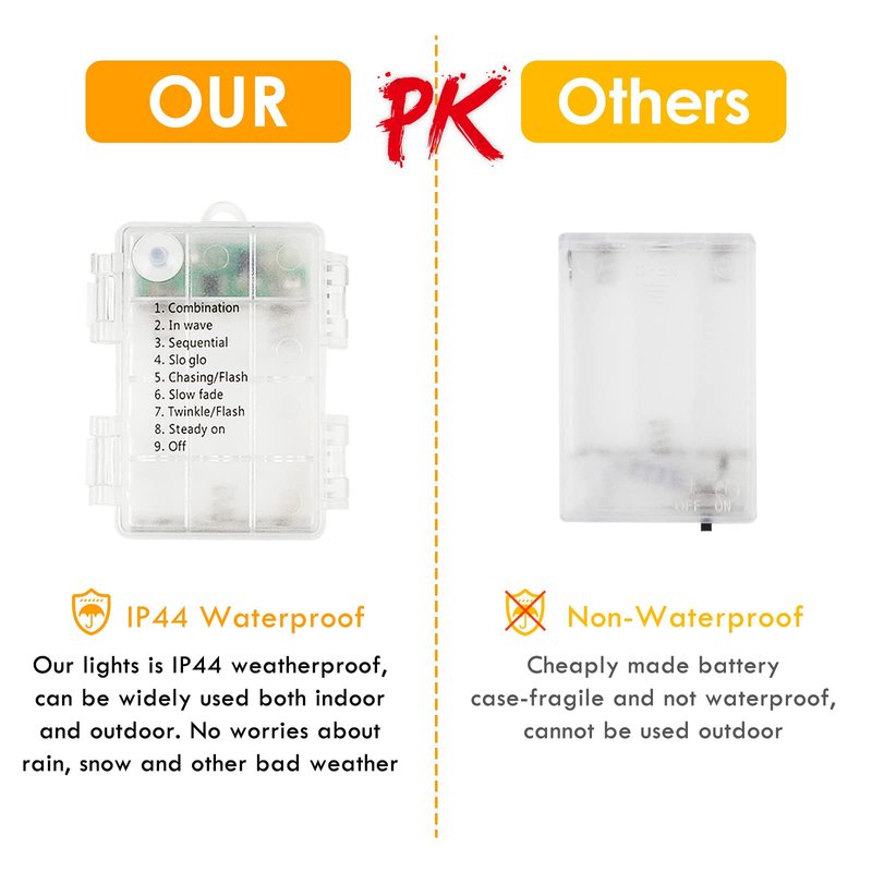 - Waterproof 8 Modes Twinkle Lights for Outdoor:Battery case is designed with IP44 waterproof structure and you can easily carry and place the LED string lights anywhere you like, no worry about rain, snow or other bad weather. Perfect for indoor and outdoor decorations.