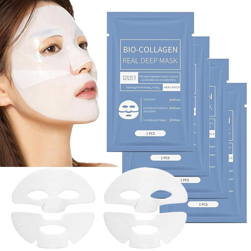 4 PACK Bio Collagen Real Deep Mask, Skinqueen Deep Collagen Face Mask Overnight, Facial sheet masks, Hydrating Real Korean Deep Collagen Mask, elasticity, firming