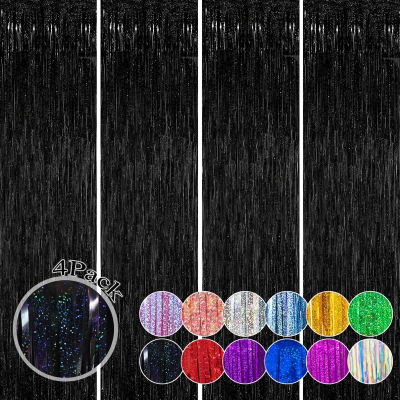 4 Pack Black Tinsel Foil Fringe Curtains, Slmeno Glitter Metallic Foil Curtain Backdrop for Party Decor, Photo Booth Backdrop Streamer for New Years Graduation Celebration Black Birthday Decorations