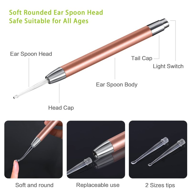 - ✅ LED LIGHT EAR SPOON DIGGER: With led light and 2 sizes of ear spoons, making it easier for you to see the ear canal, super useful for daily ear cleaning, soft and round spoon head, safe and comfort, suitable for all ages, especially for children and Seniors.
