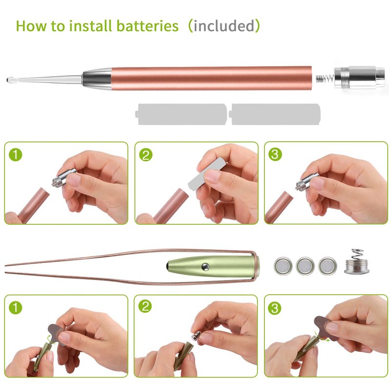 3.Ear pick with LED Light Before use, open the back cover and install the battery, then install the ear spoon head, press the button can shine.