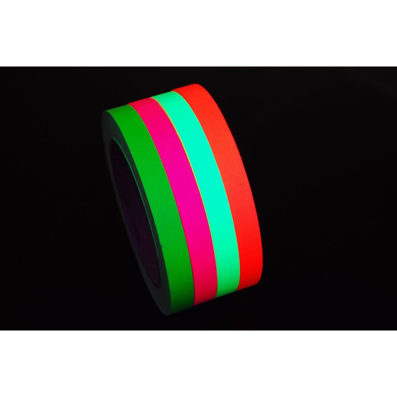 This half Inch Blacklight Reactive Fluorescent Gaffer Tape (4x20-Yard Rolls) glows under blacklight! Gaffer tape is a high quality vinyl-impregnated cloth with a non-reflective matte finish and excellent adhesion. Clean removal, abrasion and water resistance. Gaffer tape is more supple and conformable than duct tape and is used by film crews for shoots, stage sets, and at conventions for securing wires, cables and props. It has a great number of miscellaneous uses and tears easily into smaller strips, adhering better and longer than duct tape to difficult surfaces (such as climbing walls).