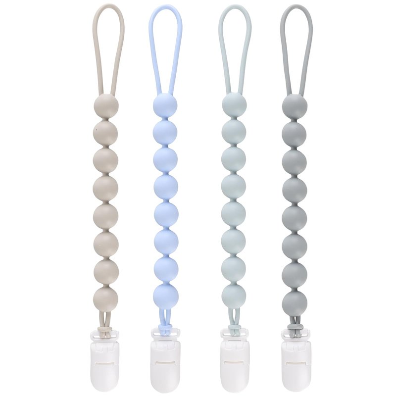 4-Pack Silicone Pacifier Clips for Baby Boys and Girls - with One-Piece Beads, Flexible and Rust-Free Holders for Teething Relief and Baby Essentials - Safe for Newborns (Grey)