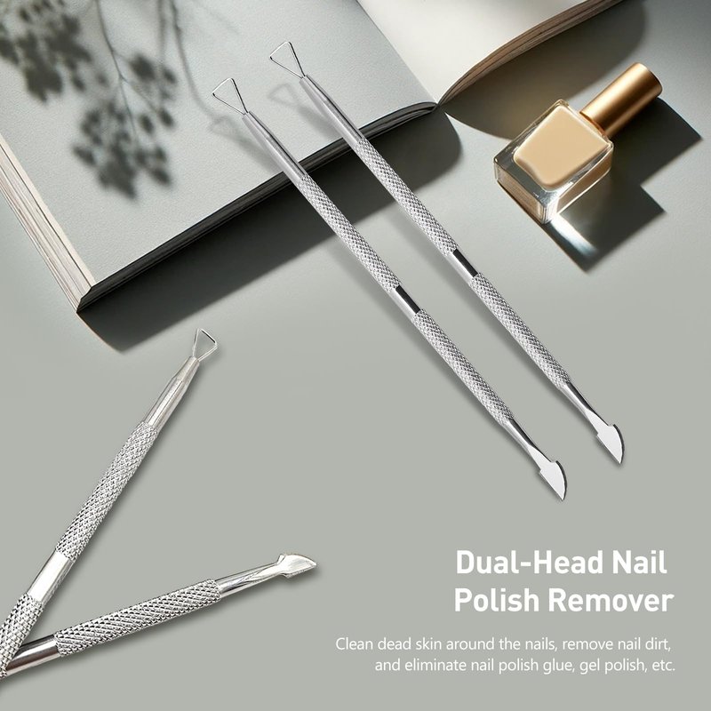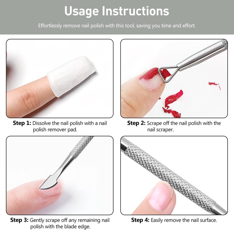 Enhance your nail care routine with our 4-Piece Stainless Steel Cuticle Pusher Set, designed for both manicures and pedicures. Crafted from high-quality stainless steel, these cuticle pushers are durable, rust-resistant, and offer strong abrasion resistance for long-lasting use. The ergonomic design features a curved end that matches the natural curvature of the nail, ensuring better and more convenient removal of nail polish without causing harm to your nails. Equipped with sharp blades, these cuticle pushers enable thorough removal of nail polish, especially on the corners, and their double-head design caters to different needs. Additionally, our set includes a nail removal pad to soften gel nails, allowing you to quickly and conveniently remove nail polish in just a few minutes. However, please note that our cuticle pushers contain sharp blades and should be kept away from children. Adults should also exercise caution and prioritize safety during use.