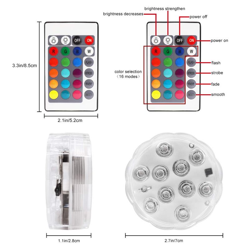 4 Pack Submersible Led Lights with Remote, 16 Colors Waterproof Pool Lights. Underwater Pond Lights, Submersible Led Lights Battery Operated, Aquarium Fountain Pond Wedding Halloween Party Lights Decorations. Widely Used Party Event Illumination for Aquarium Fountain Pond Wedding Halloween Party Lights Decorations. Holiday Accent Lighting for swimming pool, pond, ice bucket, fountain, waterfall and more. Home Accent Lighting: indicator light, night light, novelty light, etc. Specification Dimension: 2.8*1.1in Light battery: 3 x AAA batteries (not included) LED source: 10pcs SMD LED diode IR remote battery: CR2032 Button Cell batteries (included) IR Controller 16 different static colors: press the color button on the remote to select color. Brightness: press Up or Down button to adjust the brightness of static lighting. Dynamic color changing effect: select Strobe after selecting your desired colors. To achieve dynamic changing effects, Select from Fade, Flash, and Smooth to view colors changing in default order. Warning Tighten the cap (clock wise rotation) until you can not any more before placing it under water. Water can erode light quickly if the cap is not at absolute tightest position. Special occasion lighting only. Please take it out of water after using. DO NOT keep it under water forever.
