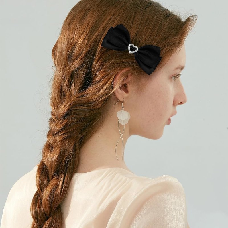 4 PACK Valentine's Satin Hair Bow Clips, Heart Rhinestone Styling Bow Barrettes Handmade Bowknot Hairpins Hair Accessories for Women Girls (Black+White)