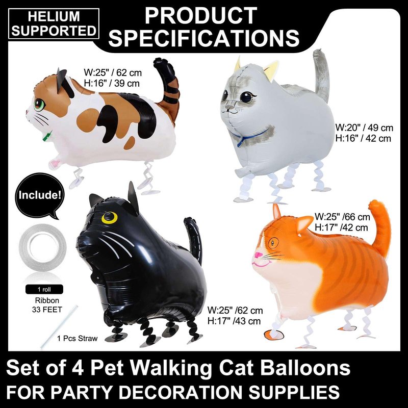 - Package Include:You will receive 4 pieces different styles of walking cat balloons, + 1pcs Straw +1pcs 33 foot Ribbon Roll