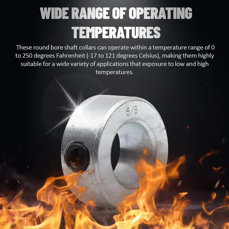 - WIDE RANGE OF OPERATING TEMPERATURES - These round bore shaft collars can operate within a temperature range of 0 to 250 degrees Fahrenheit (-17 to 121 degrees Celsius), making them highly suitable for a wide variety of applications that exposure to low and high temperatures.