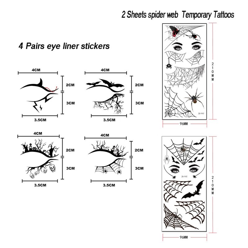 - Package: You will get 8Pcs/4pair eyeshadow stickers and 18 pcs/2 large sheet spider web bat tattoos for Halloween party face eye makeup tool.