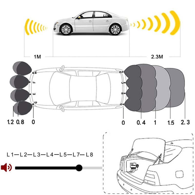 Automatically start detection when reversing, detection range: 0.3M~2.3M