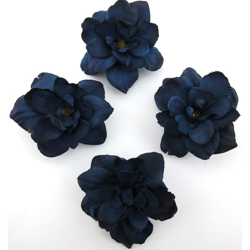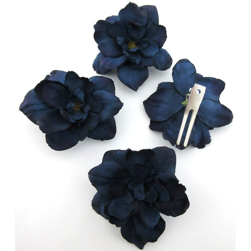 4 piece lot 2.5 inch navy blue silk apple blossoms, each attached to a 1.75" double prong alligator clip. Perfect finishing touch to a pin up or updo, headband or beanie....clip to your favorite scarf or hat! Cluster a few together for a larger flower look & bridal.