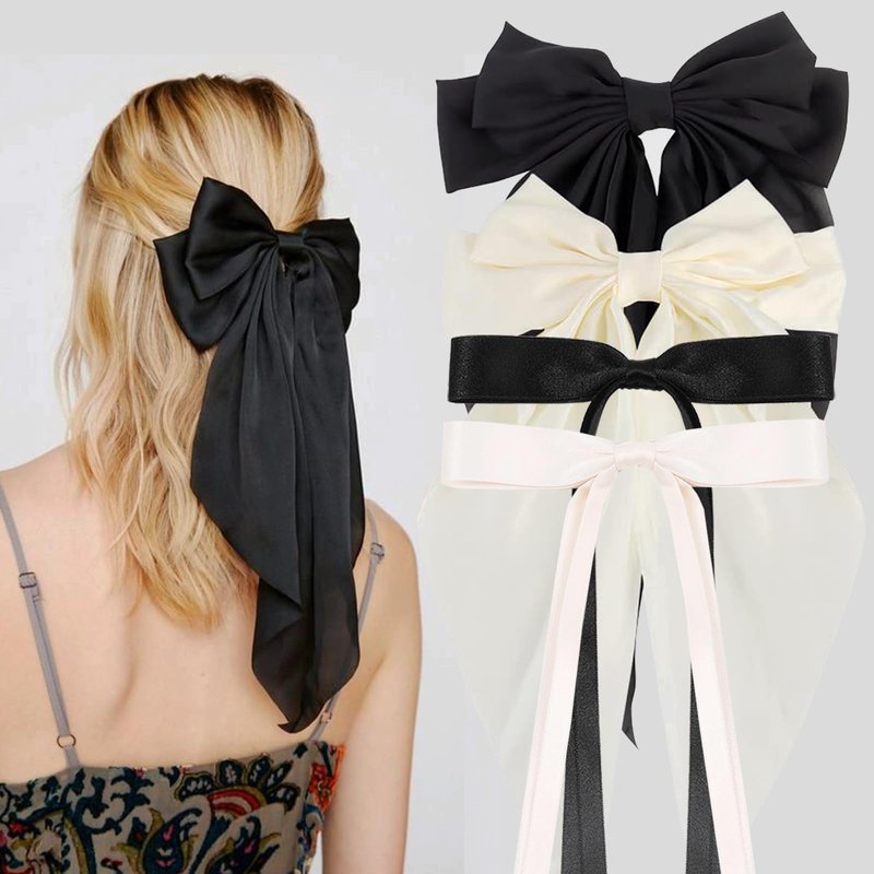4 Pcs Hair Bows Clips for Women Girls - Silky Satin Big Bows Clips | White/Black Bow Hair Barrettes | Tassel Hair Ribons Bows with Oversized Long Tail - 2 Style