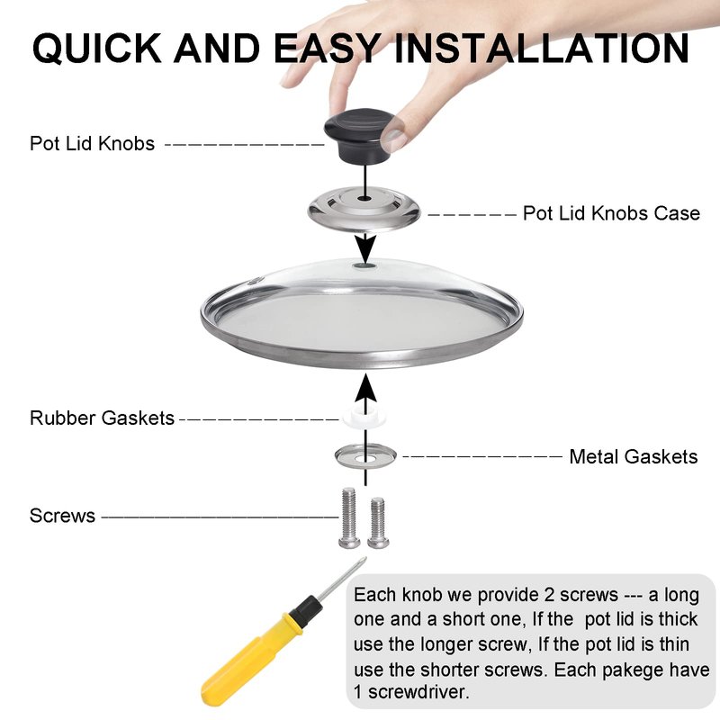 - Easy to Install: Each product we have equipped with two different lengths' screws to make product use more flexible. Long screws are suitable for thicknesses such as glass lids, short screws are suitable for thinner stainless steel lids, etc. Each knob contains 1 silicone gasket and 1 stainless steel washer for pot and pan covers. That ensuring an excellent watertight fit.