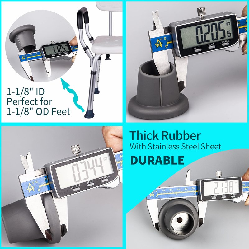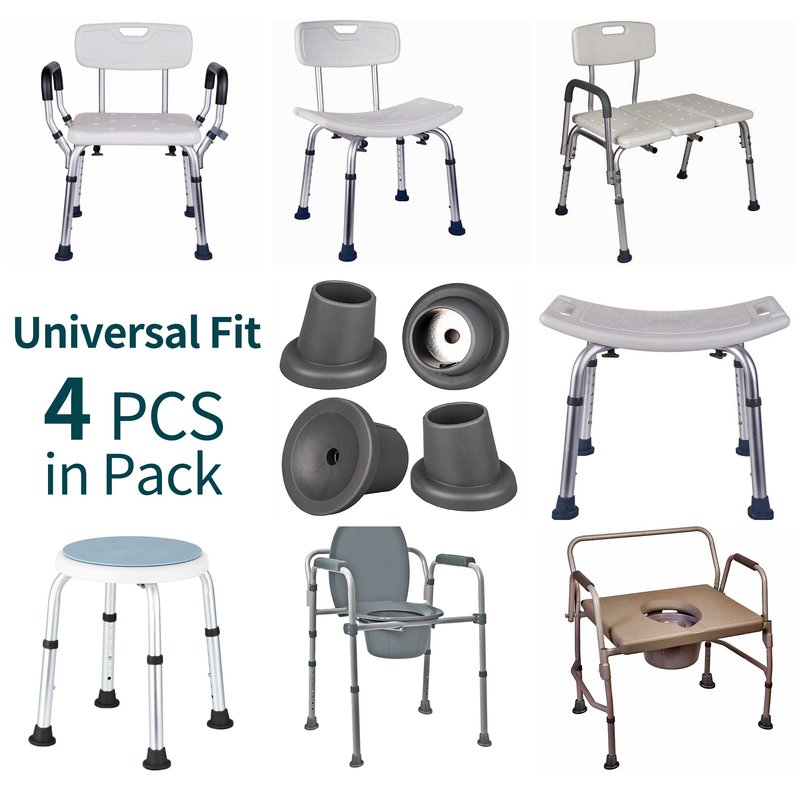 - 4 PCS IN PACK & UNIVERSAL FIT. - Inside diameter is 1-1/8 inch(28mm), Fit for 1-1/8" tubing shower seats, bath chair, bathtub transfer bench, bedside commode chairs and shower bench. Its bottom is 2.14 inches outside diameter. 4 pcs in pack meets bath stool 4 feets replacement.
