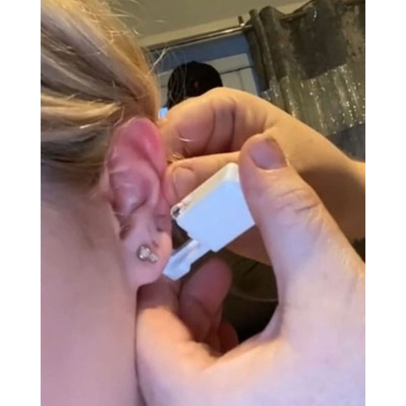 Step 4: Push hard, the ear stud will stay on the ear, and the piercing gun body will automatically fall off