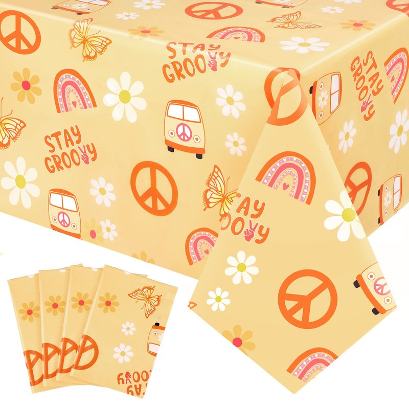 - Hippie Boho Design: the groovy table cloths for parties are printed with novel boho patterns such as daisy flowers, victory signs, buses, butterflies, and the letters [stay groovy]; It's richly patterned, colorful and lively, can create a warm atmosphere for your party and leave everyone unforgettable memories