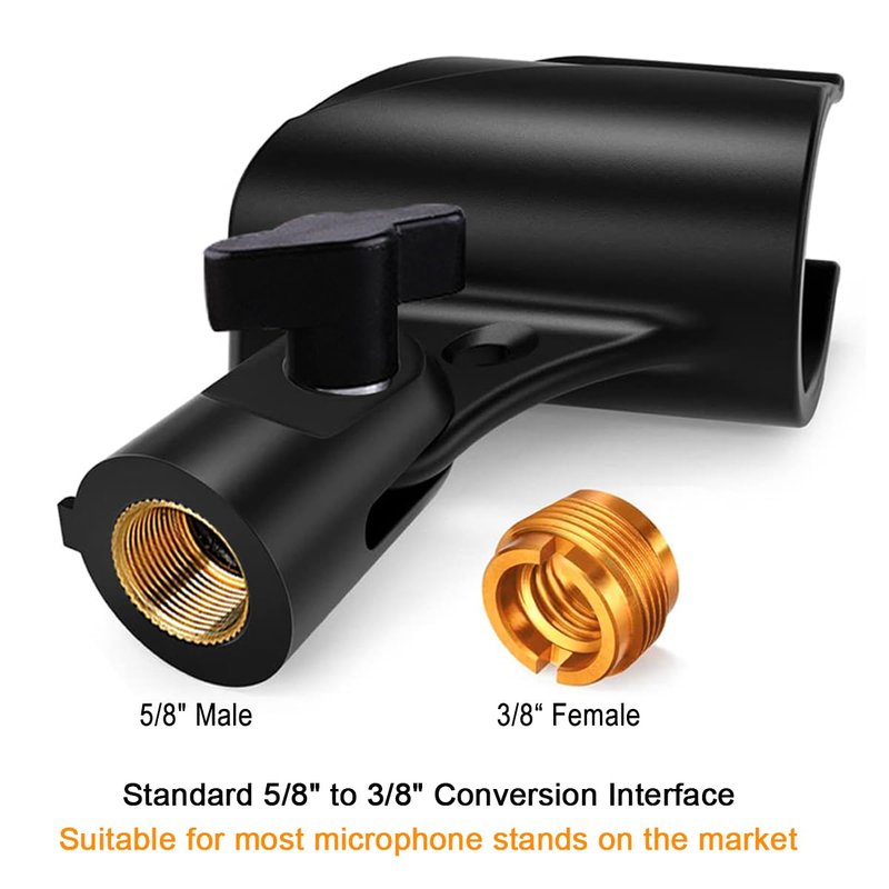 - Universal microphone clip holder come with 5/8" male to 3/8" female metallic screw adapter.Suitable for most handheld microphones and mic stands on the market.