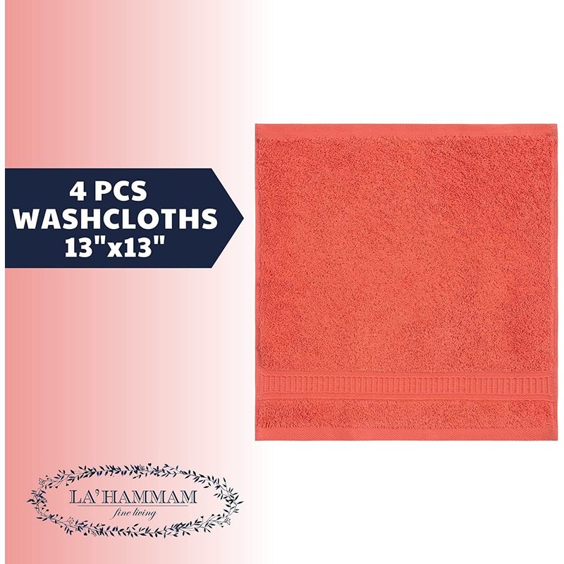 4 Piece 13” × 13” Soft Turkish Cotton Washcloths for Bathroom, Kitchen, Hotel, Spa, Gym & College Dorm | Absorbent and Super Soft Washcloth Set for Body & Face, Baby and Adults - Coral
