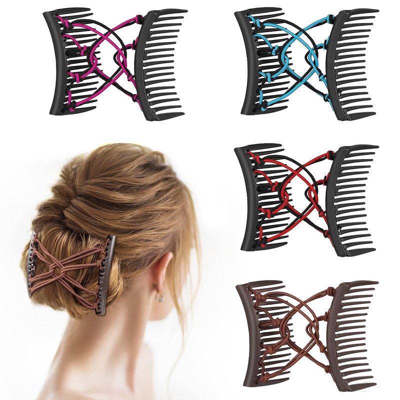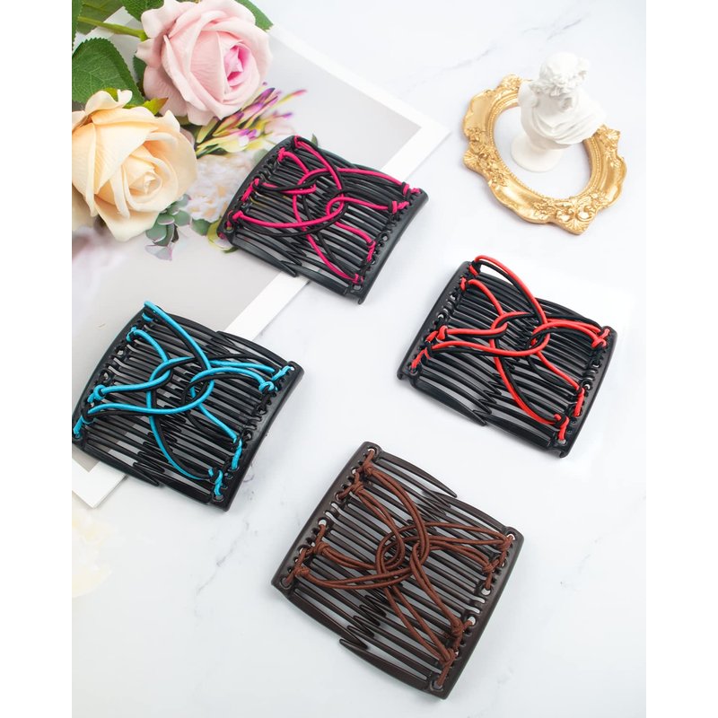 4 Pieces Magic Hair Combs for Women Accessories, Stretchy Double Comb Hair Clip Adjustable Elastic Hair Comb for Thick Curly Thin Hair, Adjustable Magic Hair Clip Combs (Blue, Coffee, Red, Rose Red)