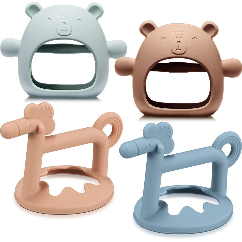 4 Pieces Silicone Teething Toys Bear Baby Teether Toy Anti Dropping Horse Teething Pacifier Baby Chew Toys Chewable Hand Teethers for Sucking Chewing Needs Pain Relief Gifts (Blue, Caramel, Pink)