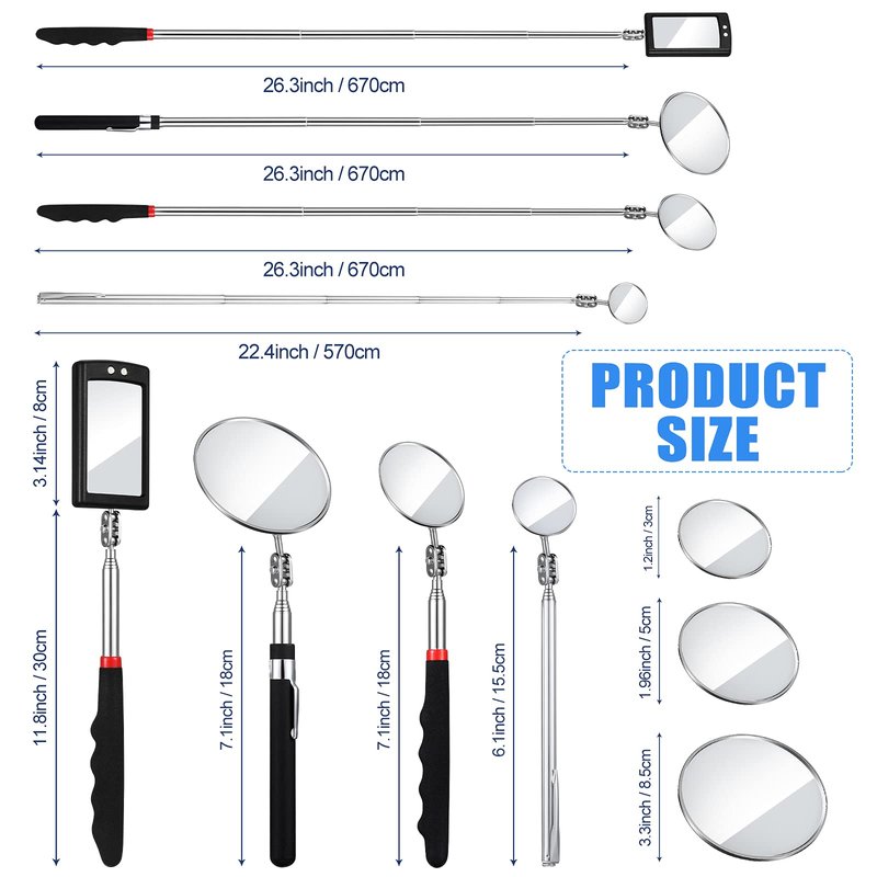- Ideal choice: rotatable telescopic inspection mirrors are ready when you need them, and stored in garages, tool boxes, cars, dressing tables, cosmetic bags or wherever you need them when not in use; you can also be given as gifts to friends, family, etc.