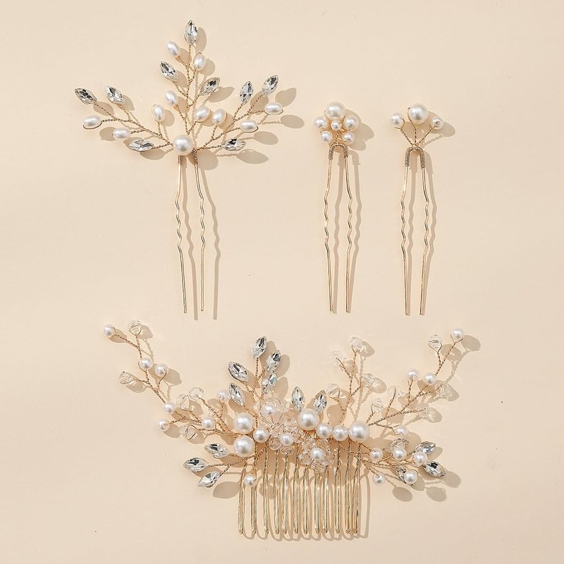 These elegant 4 piece hair accessory set makes a lovely addition to any bridal hairstyle. Featuring gold plated combs and pins adorned with shimmering imitation pearls and crystals, this set will add just the right touch of glamour to your big day. Whether worn together or separately, each piece helps frame the face with subtle sparkle. The combs smoothly gather hair while staying securely in place. Pins discreetly fasten hairstyles and veils with delicate flair. A pretty complement for brides, bridesmaids and wedding guests alike.