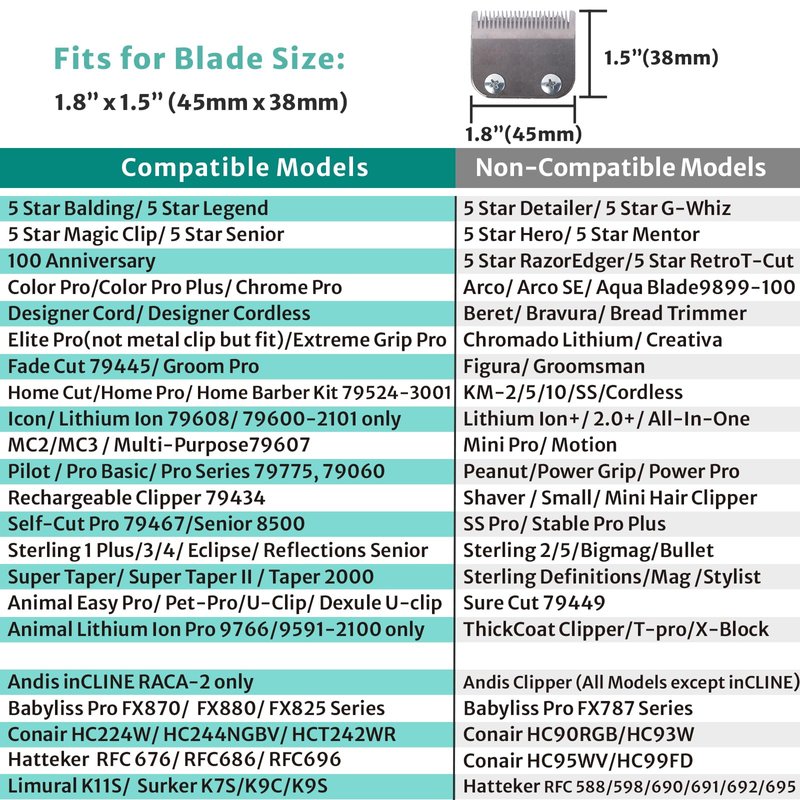 - Fit Other Model: Andis inCLINE RACA-2, Babyliss Pro FX870/ FX880/ FX825 Series, Conair HC224W/ HC244NGBV/ HCT242WR, Hatteker RFC 676/686/696, Limural K11S and Surker K7S/K9C/K9S.
