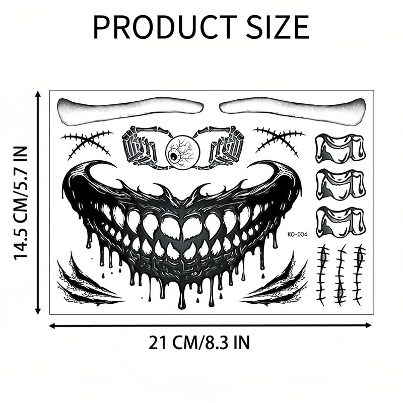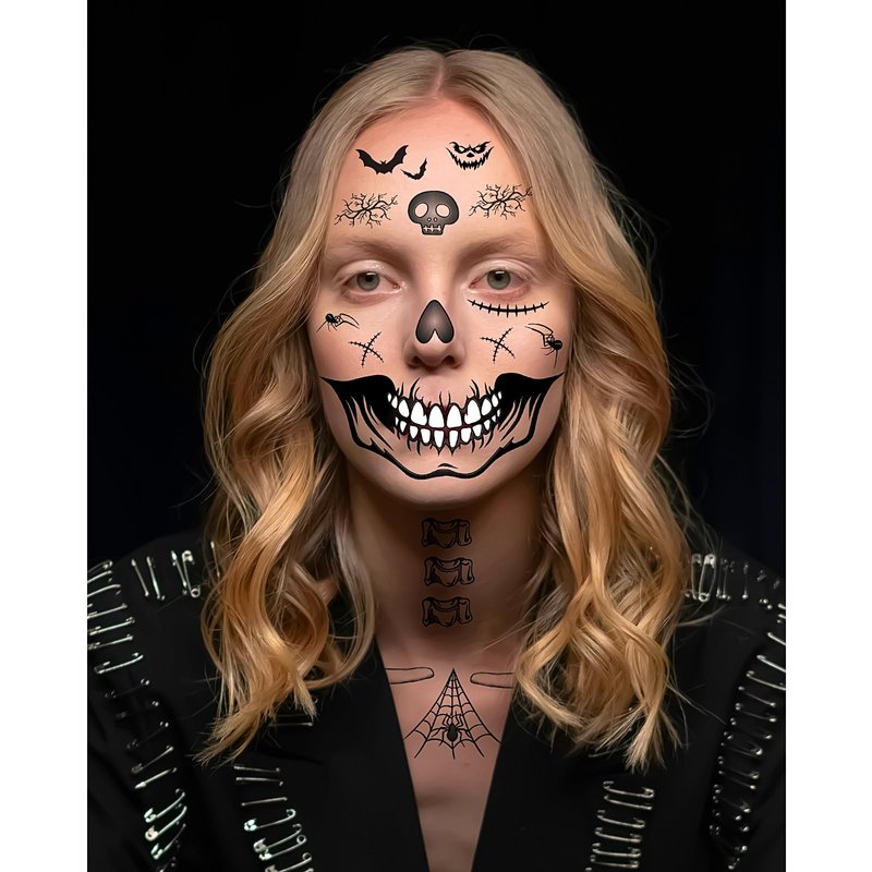 - What You Get: 4 sheets of realistic Halloween face temporary tattoos sticker fashion designs, zombie makeup kit for kids and adults vampire Halloween temporary tattoos for adults. there are 4 sheets of chucky makeup face fake stitches scratches sugar skull bat witch spiderweb spider web horror scar scab scary blood cut wound temporary tattoos for kids in each package of cute size 21x14.5cm 8.3"x5.7" spider temporary tattoos for women men daughters sons children bulk.