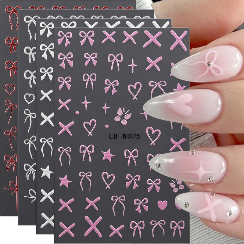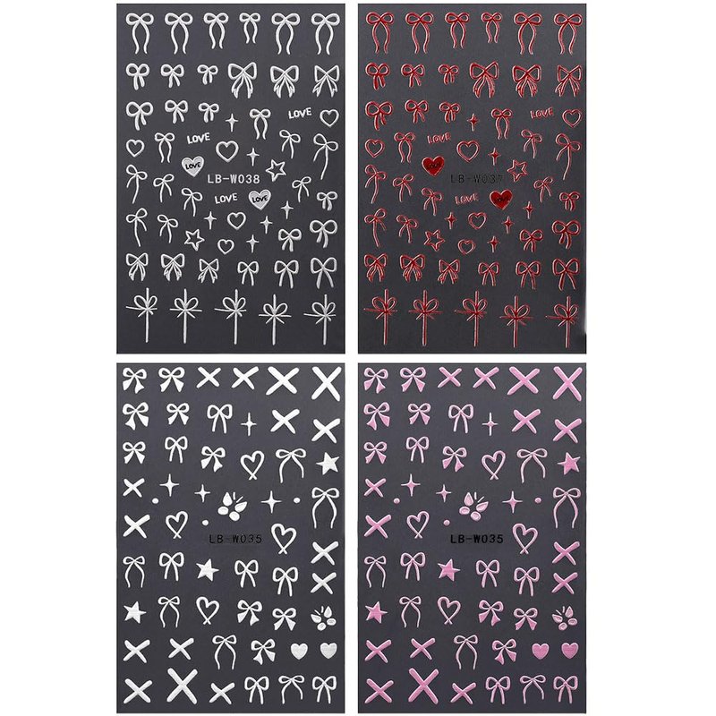 4 Sheets Embossed Bow Nail Stickers,Cute Bows Ribbon Nail Art Stickers Pink Red White French Bowknot Star Heart Nail Decals Y2K Butterfly Sticker Nails for Nail Design Nail Decor Nail Art Supplies