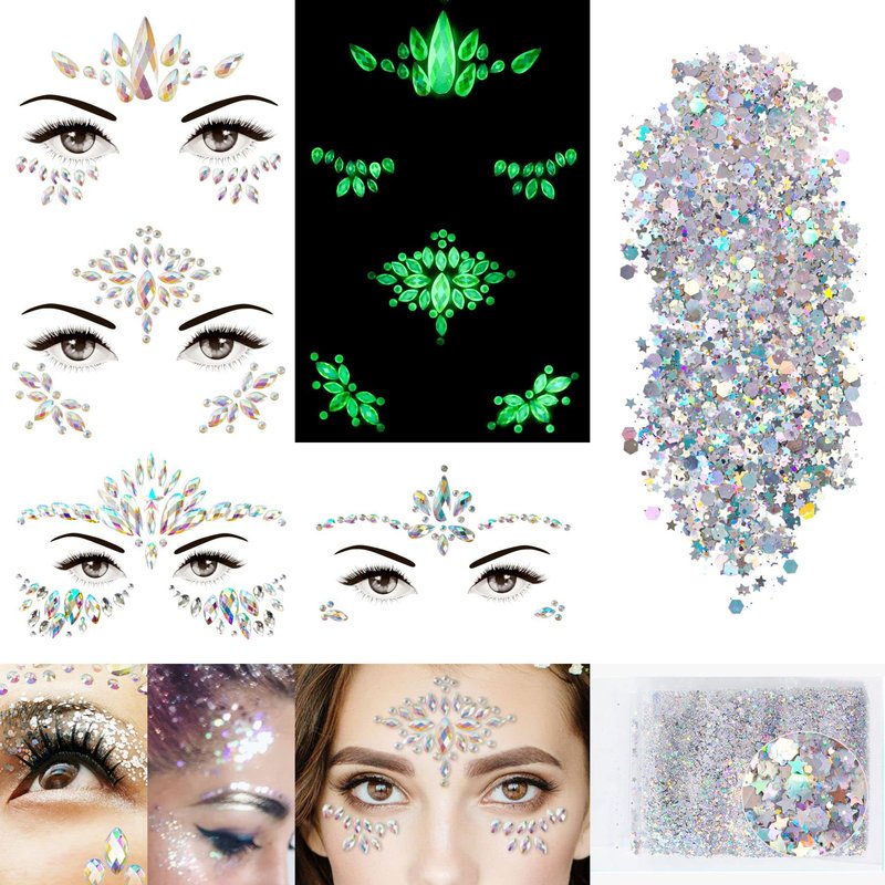 - Pretty And Sparkly: You will get 2 luminous face gems body stickers glow in the dark, 2Non-luminous face jewels rainbow stickers and 10g chunky and fine body glitter. Even in a dark environment, Noctilucent face jewel can cast a bright light. Please illuminate the luminous face tattoo crystals rhinestone sticker with light before using them. This operation will make the body jewelry look more clearer. 3D iridescent euphoria makeup and glitter, shine bright, stunning you stand out from the crowd.