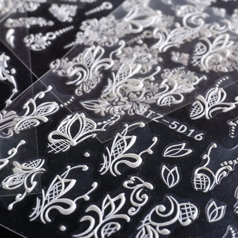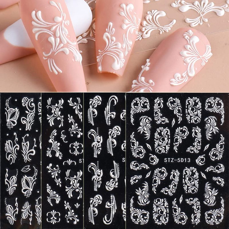 - 5D Embossed Nail Stickers: 4 sheets 2022 new design 5D self-adhesive white flowers nail art decals, will not fade naturally, with instructions, you will create a unique nail art through DIY.