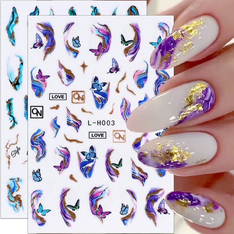 - 【Nail Art Nail Design】Purple marble smoky nail stickers and blue marble smoke design nail art stickers, which with golden wave lines and butterfly.you can create a a one-of-a-kind nail art according to your hobbies, so that your nail art is different every day.