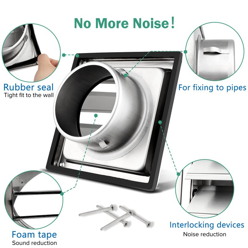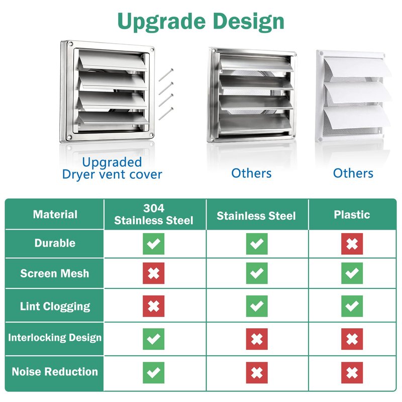 - ✅[Upgrade Design]No screen, when it is used for the vent of the dryer, stainless steel dryer vent cover will not be blocked by lint. We are the only company that uses interlocking design and foam tape to achieve noise reduction. Outlasts the plastic type!