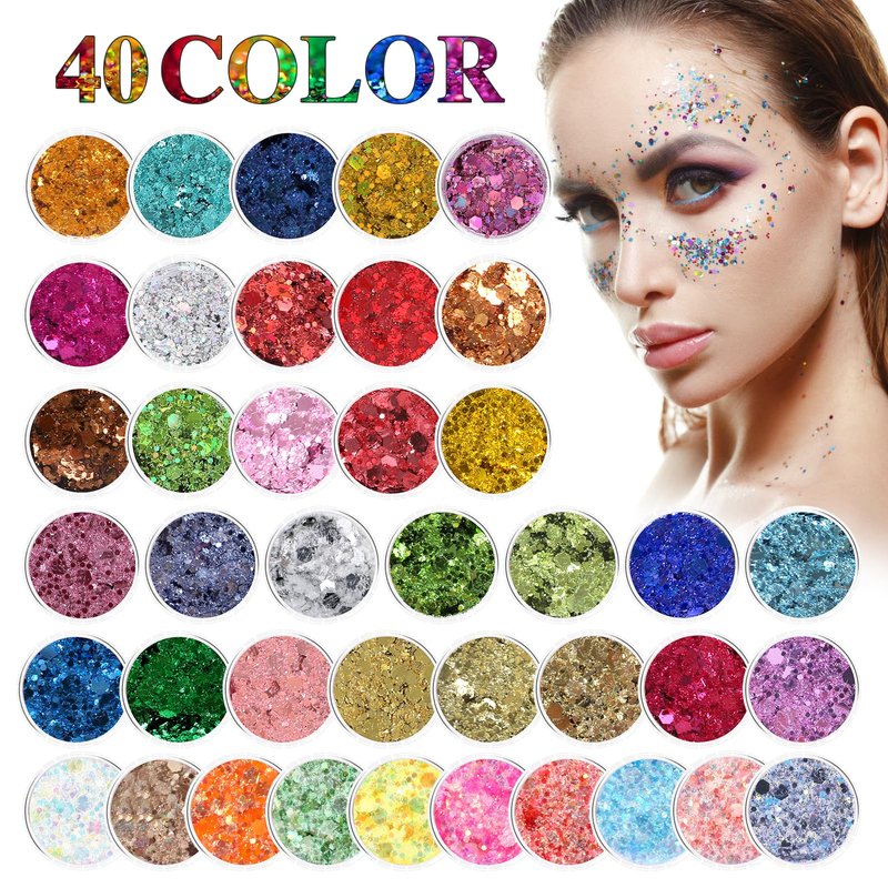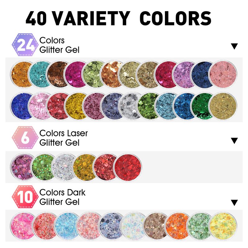 Our body glitter includes 40 colors, 24 colors glitter gel, 6 colors laser glitter gel, 10 colors dark glow glitter gel. This makeup glitter gel has a good mix of larger chunks and very fine glitter that makes it look very shimmery. Providing more color choices for your makeup, shine in the crowd.