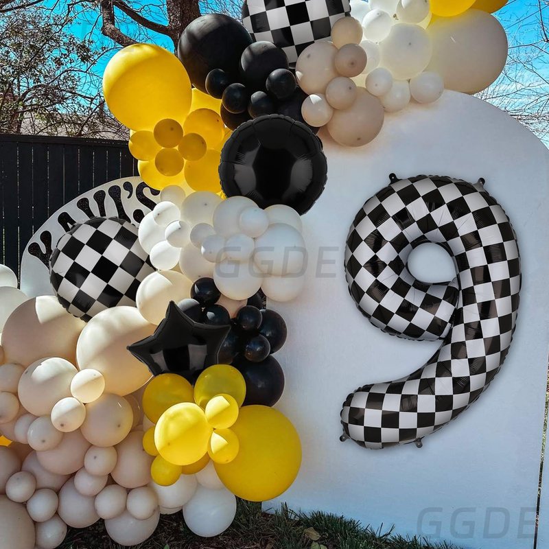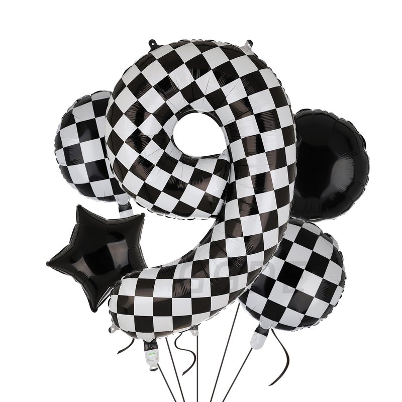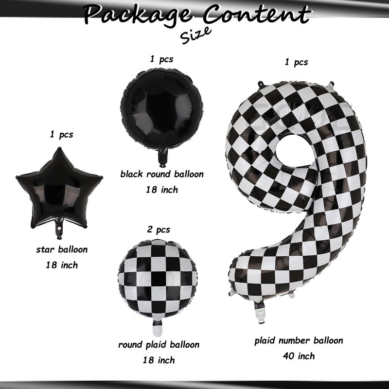 - Package/Size: 1 pcs 40 inch checkered number balloon 9 black and white ,2 pcs black and white chequered foil balloons, 1 pcs star balloons black,1 pcs round balloons black .