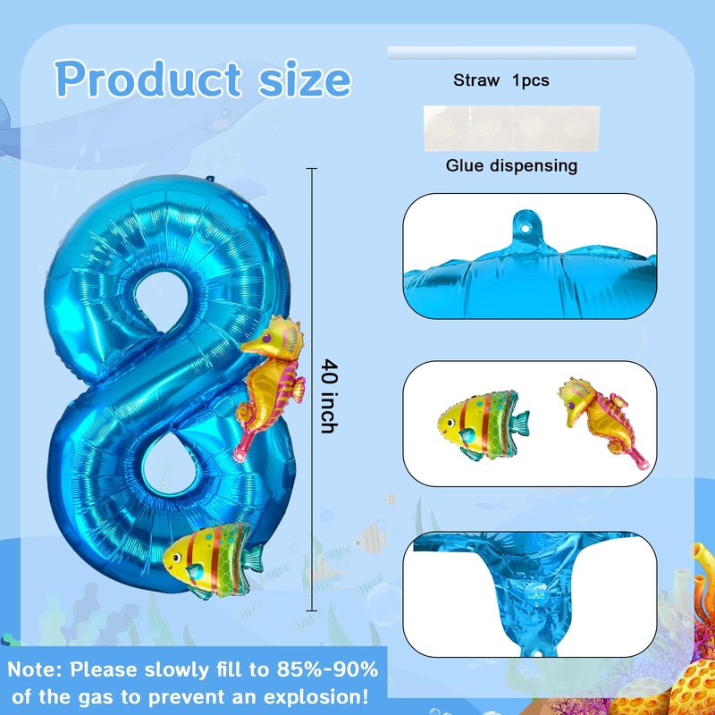 - 【Durable and Reliable Materials】: Our 40 inch number 8 balloon under the sea is made of high-quality aluminum foil material, non-toxic and odorless, with high quality technology with neat edges that are not prone to explosions and leaks is ideal for birthday parties. And can be safely used around children, will bring life to the birthday party decorations for your child. Also after deflating can be reused and recycled, withstand long-term entertainment.