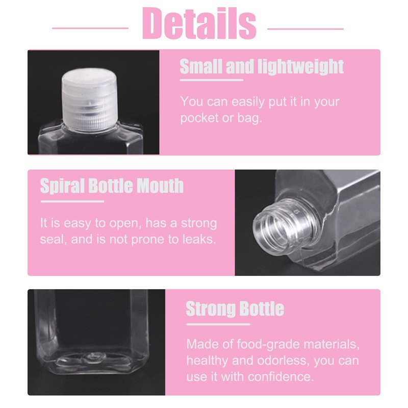 - Size:Each clear flip-top bottle holds 60ml/2oz,making it easy to put in your bag.Perfect for perfumes,cosmetics,lotions,and cleaning supplies.