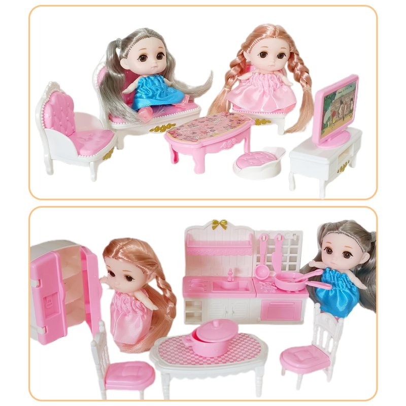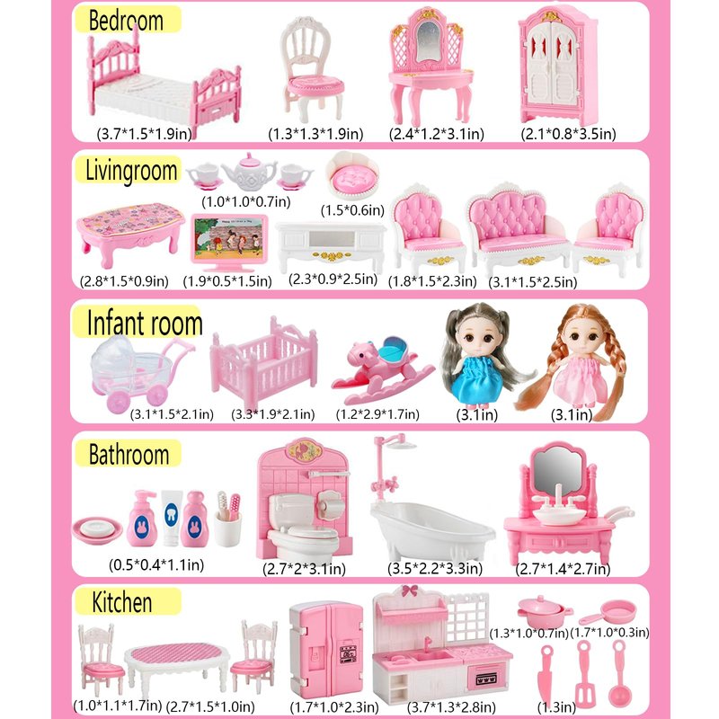 You will get 2*dolls, bedroom, bathroom, living room, kitchen, infantaccessories, every mini toy house toy set containing rich accessories from the doll house suit. Children can use this toys house furniture to decorate their own micro toy houses and create their dreams.