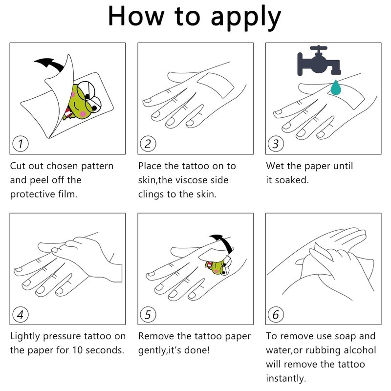 - 😆【Easy to apply】Cut out the desired motif and remove clear sheet > Place tattoo on clean + dry skin > wet the temp tattoo with water and wait for 10 seconds > Remove paper, allow tattoo to dry and enjoy!
