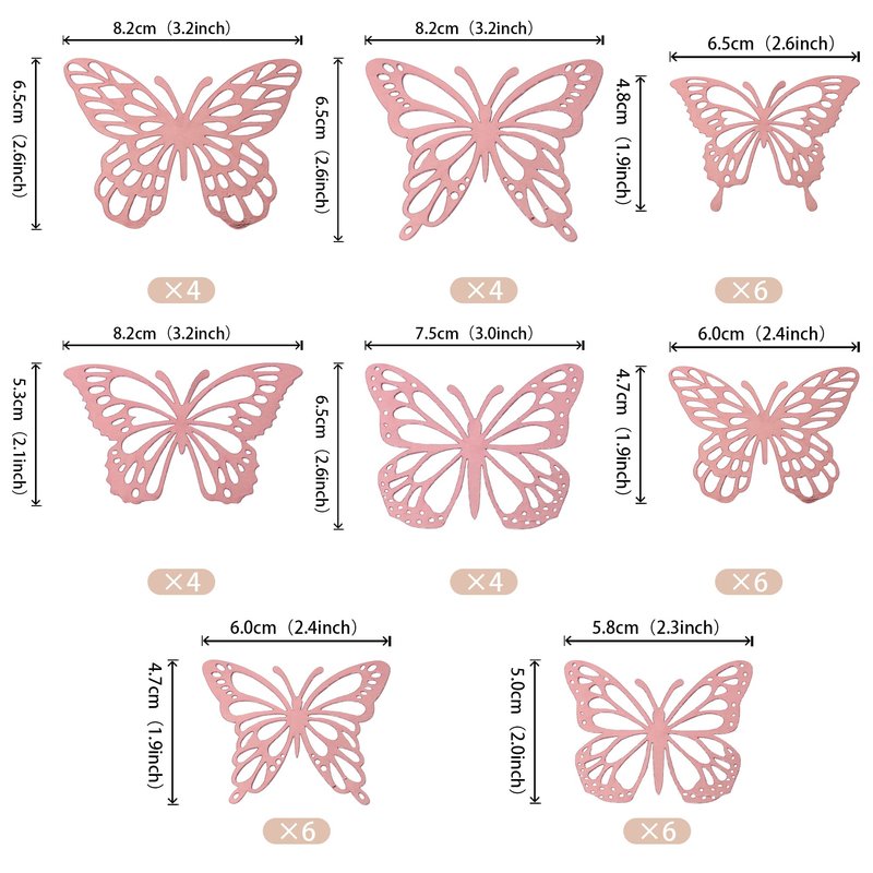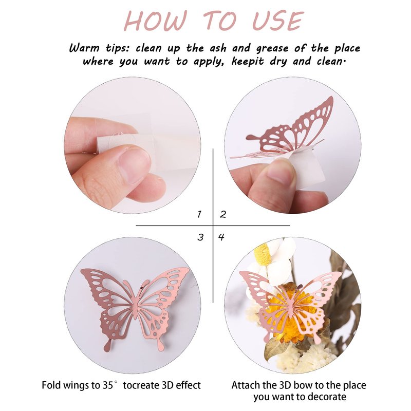 - Use Points ! The package is including the glue point dots, butterfly gently fold can be a butterfly which has a 3D effect,then you can put them with dots to the cake and cupcake, you can also use it as wall decorations, there is no sticks.
