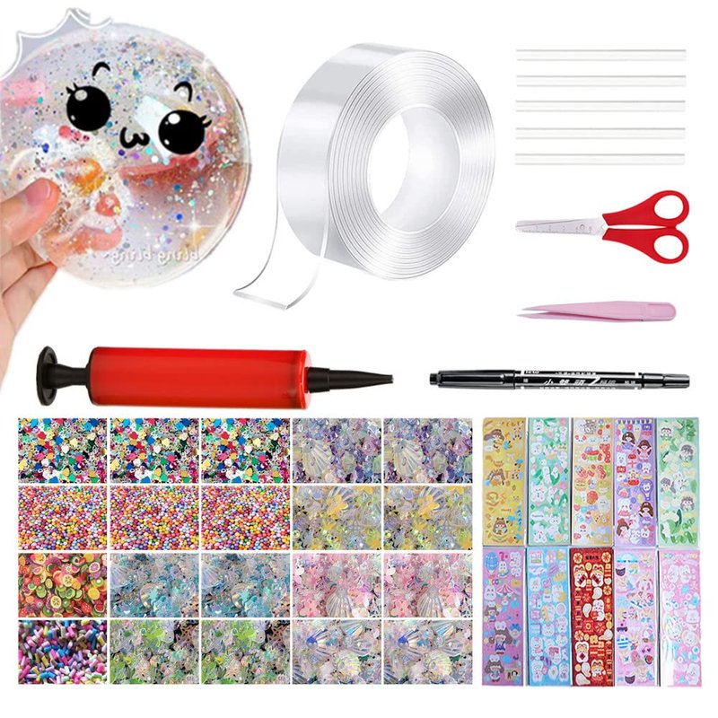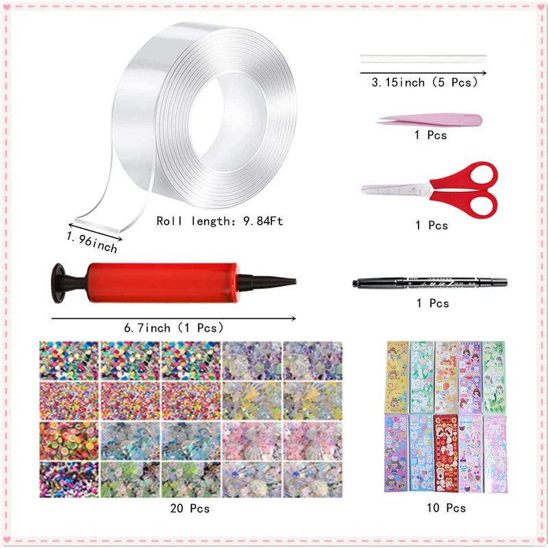- What You Get? 1 nano tape (1.97 inches x 9.84 feet), 1 clip and scissors (color sent randomly), 5 straws, 20 packs of balloon fillings (sequins and small colored balls), 1 pen, and 1 balloon inflator. 10 stickers (not repeated). If you have any questions, please contact us and we will provide you with the best service.