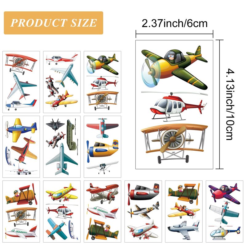 - Airplane Temporary Tattoos: 12 Sheets 40 patterns airplane tattoos with an vibrant color will be the leading priority for children having passion for airplane collection. Cute planes filled with various appearance of helicopter, jet, aircraft etc. Each sheet size is 4.13 x 2.36 inch.