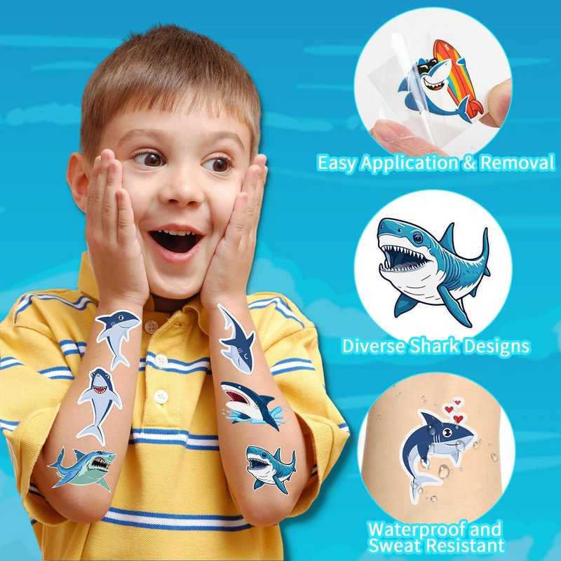 - What You Get: More than 280 styles temporary shark tattoos themes for kids, which measures 3.8x2.4 inch. Asetof mixed style tattoos can meet the kids shark themes party need!